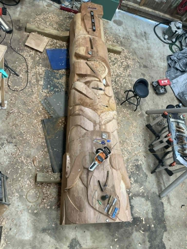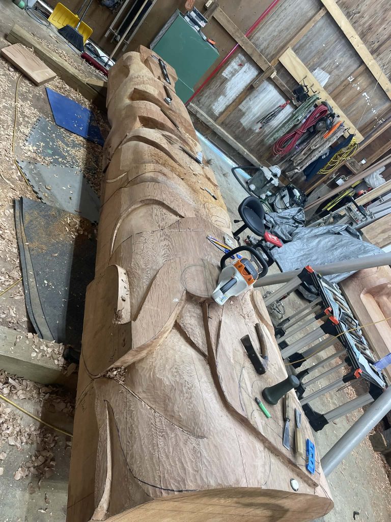 This 16’ pole is being carved from a piece of salvaged red cedar. The design incorporates animal species connected to the waterways of the Pacific Northwest. In Kwakwala, the name t̓saxa̱ns translates to “ocean spray.’ This work is available for purchase, so if you are interested in acquiring t̓saxa̱ns for your own collection, please inquire via email.
