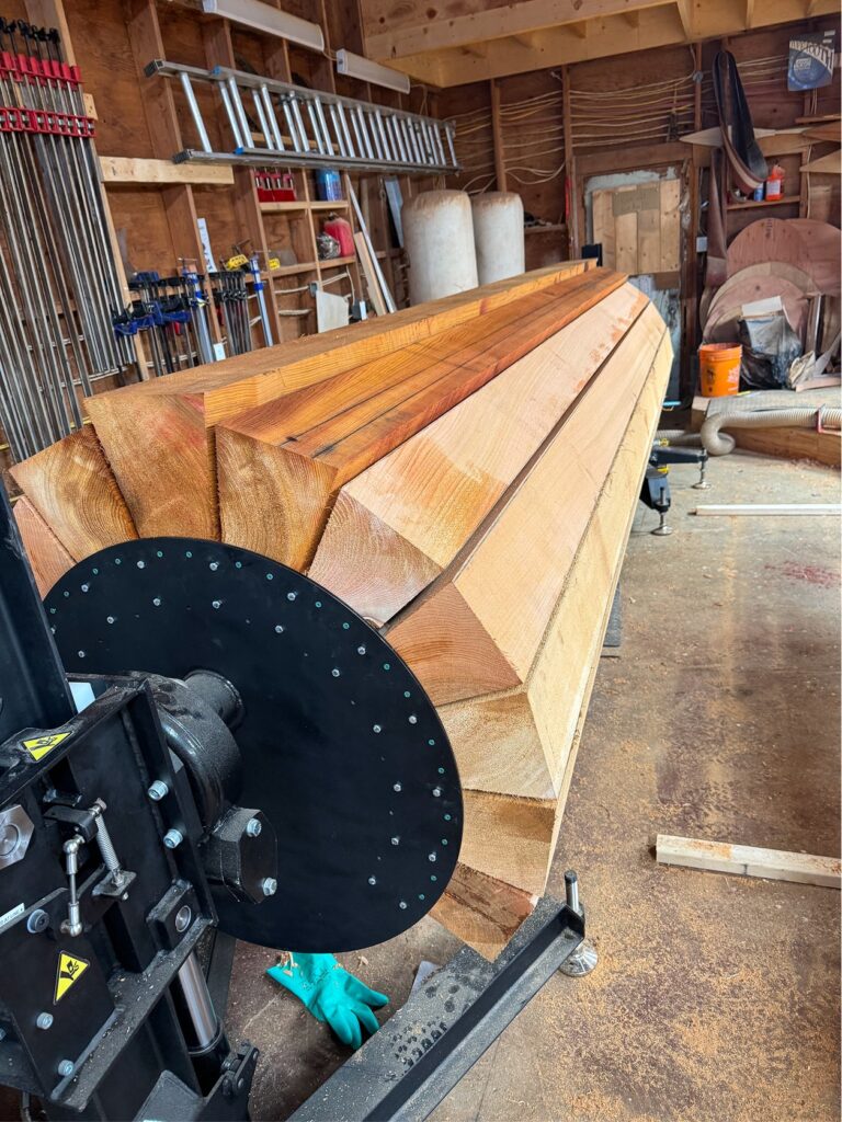 This 12’ private commission is the next in Carey’s Totem 2.0 series. After completing the first version, Kamtila, he has made a few adjustments. To provide a stable centerline he is using 13 instead of 14 beams, the middle and adjacent beams are cut thicker to enable more dimension on the faces of the figures, and this time the beams were cut by modifying a mill, instead of using chainsaws.